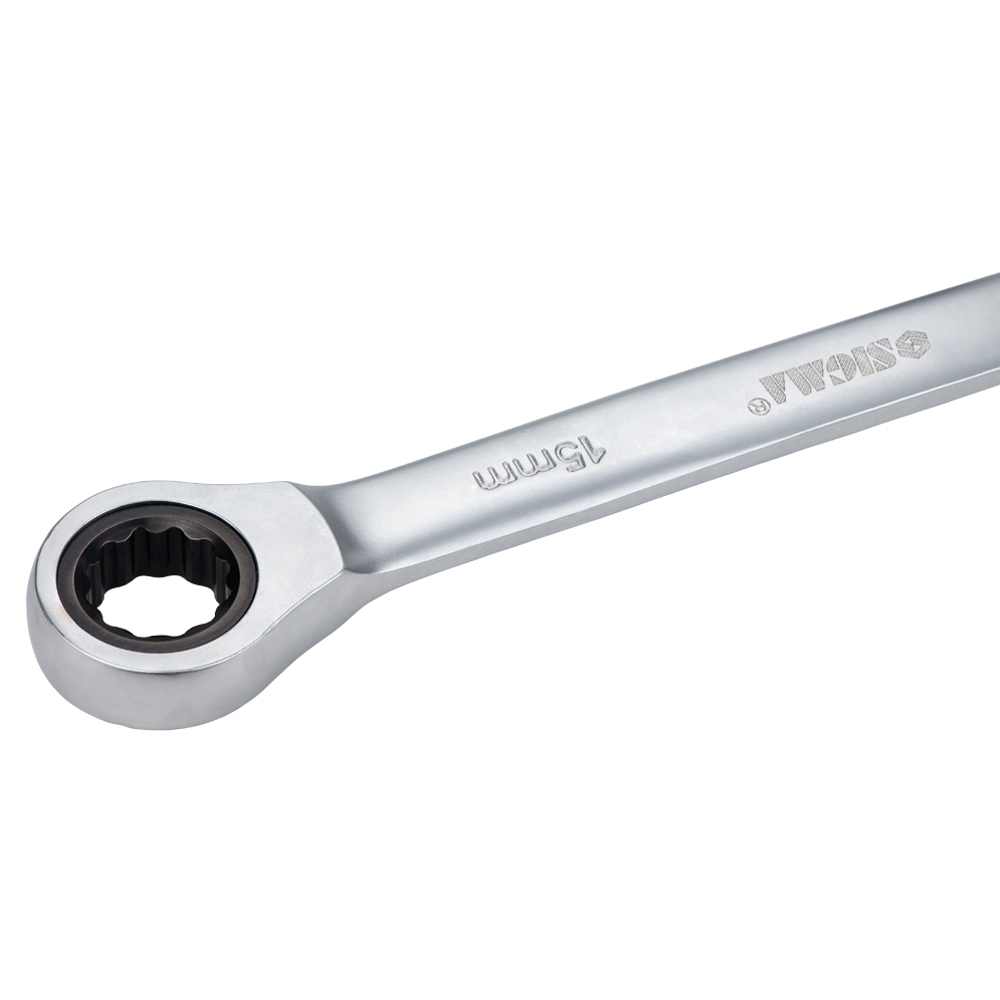 Ключ ріжково-накидний тріскачний 15мм CrV satine Sigma (6022151) виготовлений з хром-ванадієвої сталі, має антикорозійне покриття з хрому. Рожкова і кільцева зівка ключа відполірована. Призначений для монтажу-демонтажу різьбових з'єднань. Профіль кільцевого зіва має 12 граней, що збільшує площу зіткнення робочих поверхонь та знижує ризик деформації граней кріплення при монтажі. Кут нахилу кільцевого зіва щодо площини ключа робить монтаж зручнішим.