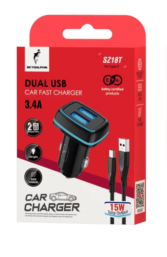 Автомобільний зарядний пристрій SkyDolphin SZ18T (2USB, 3.4A) Black (AZP-000100) + кабель Type-C