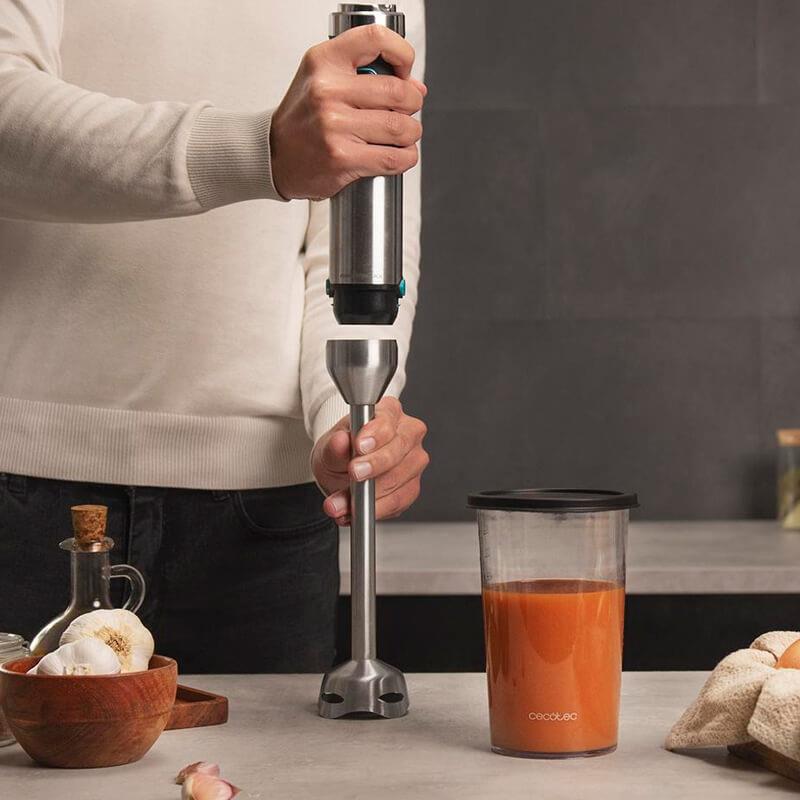 Блендер занурювальний CECOTEC Power TitanBlack 1500 XL TotalMix Завдяки повному набору аксесуарів ви зможете насолоджуватися незліченними рецептами за допомогою одного приладу. Приготуйте збиті вершки та безе за допомогою віночка для збивання, повітряні тістечка за допомогою інноваційних віночків, гладкі та вершкові пюре за допомогою пристосування для пюре, наріжте, подрібніть і змішайте всі види продуктів, створіть смачні вироби з фруктів та овочів з ексклюзивною насадкою. Приготуйте все, що тільки ви можете уявити з Power TitanBlack 1500 XL TotalMix. Леза максимальної твердості та гостроти. Подовжена ніжка XL. функція Turbo. Система Fix Plus. Захист від бризок. Потужність 1500 Вт. Леза максимальної твердості та гостроти. Інноваційна технологія CrossBlades з 4 лезами з титановим покриттям дозволяє миттєво отримати найкращі результати за рахунок збільшення твердості та часу заточування, дозволяючи подрібнювати навіть найтвердіші продукти, такі як лід. Подовжена ніжка XL. Power TitanBlack 1500 XL TotalMix має дуже довгу ніжку XL для більшої зручності та комфорту при повсякденному використанні, дозволяючи змішувати як у великих каструлях, так і у високих склянках. Регульована швидкість та функція Turbo. Power TitanBlack 1500 XL TotalMix має регульований перемикач швидкості та функцію Turbo, щоб з повною точністю адаптуватися до потреб будь-якого рецепту. Скористайтеся перевагами низьких швидкостей для більш м'яких продуктів або збивання яєць, а також високими швидкостями або Turbo для збивання більш твердих продуктів. Система Fix Plus. Система Fix Plus, одним клацанням гарантує легке кріплення та від'єднання для більш швидкого встановлення аксесуарів. А коли все буде готове, помістіть аксесуари в посудомийну машину для зручнішого та безпроблемного очищення. Захист від бризок. Захист від бризок забезпечує більш чисте використання за рахунок одночасного перемішування та подрібнення без забризкування робочої зони. Склянка на 800 мл з кришкою допоможе вам приготувати всі рецепти та зберігати їх у холодильнику. Максимальна продуктивність при 1500 Вт. З Power TitanBlack 1500 XL TotalMix ви можете працювати з максимальними потребами завдяки його потужності 1500 Вт, отримуючи дрібні та однорідні суміші за лічені секунди та без зусиль. Ергономічний дизайн для використання без зношування. Ергономічний дизайн та кнопки полегшують тривале використання без зносу. Крім того, ручка має покриття Soft Touch з м'яким захопленням, яке ідеально адаптується до вашої руки, забезпечуючи більший контроль та комфорт.