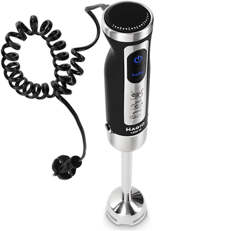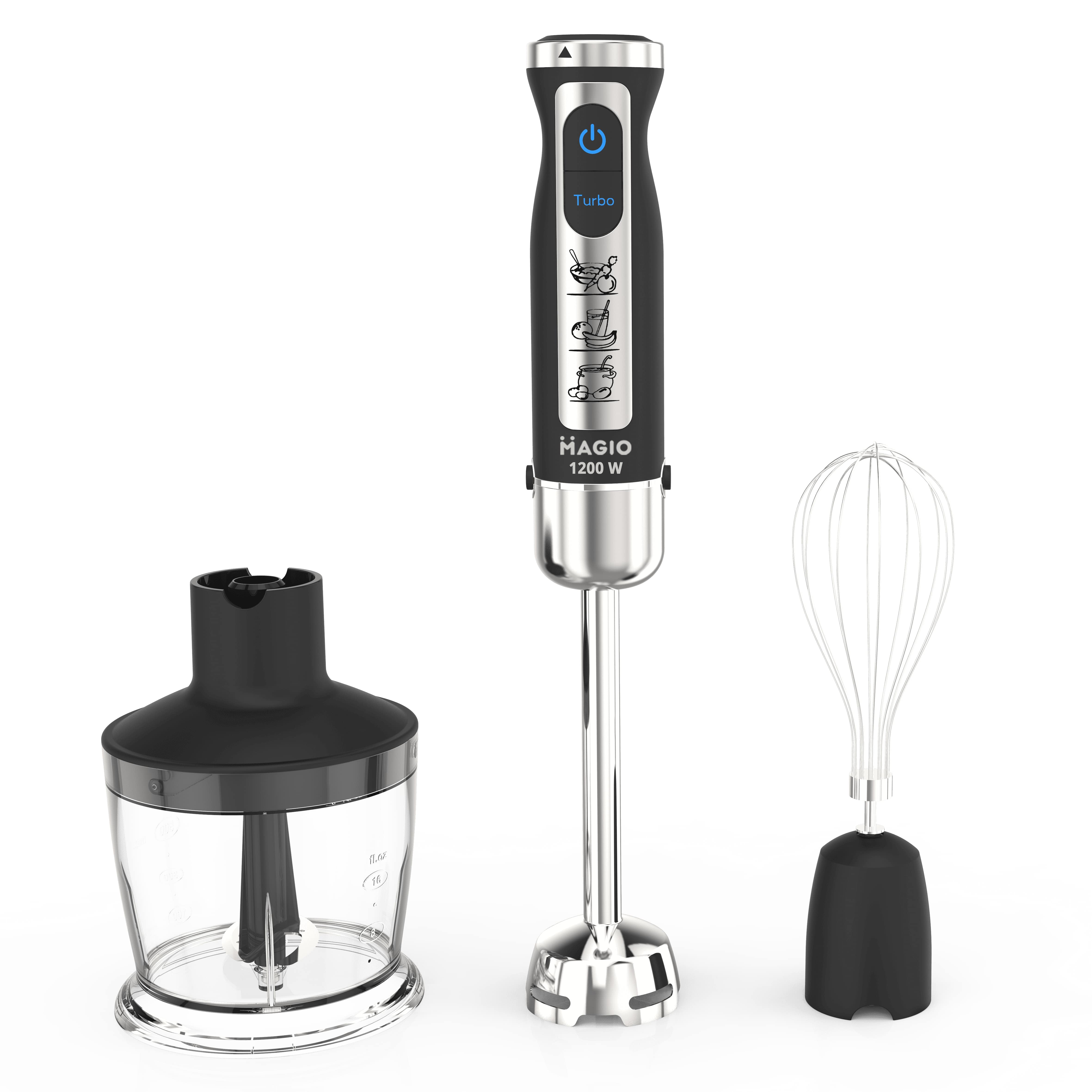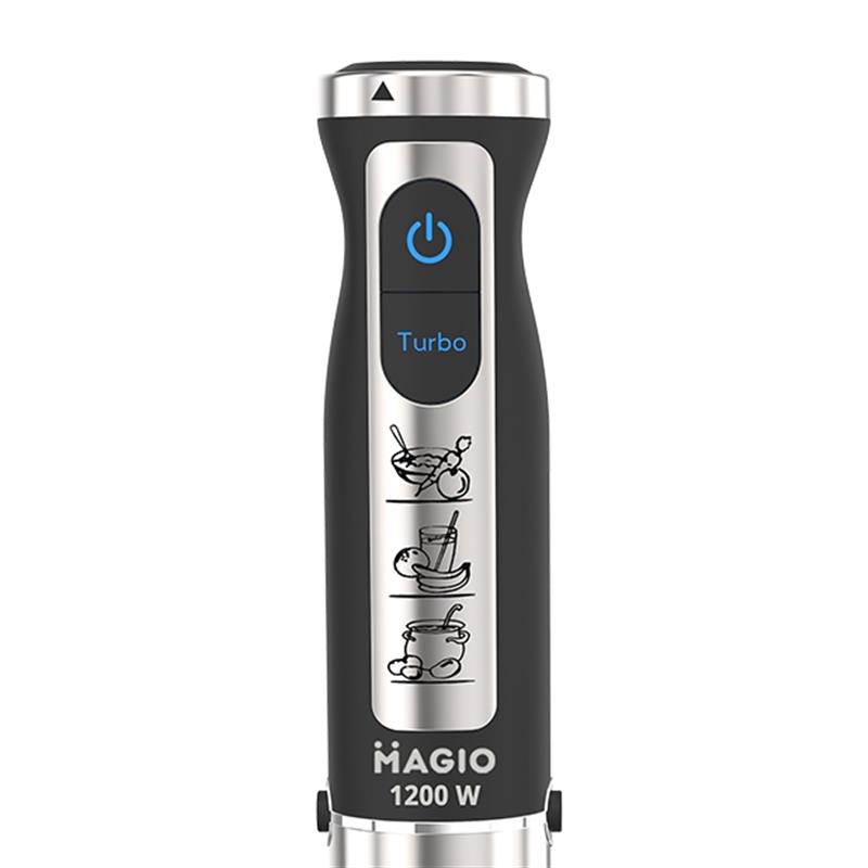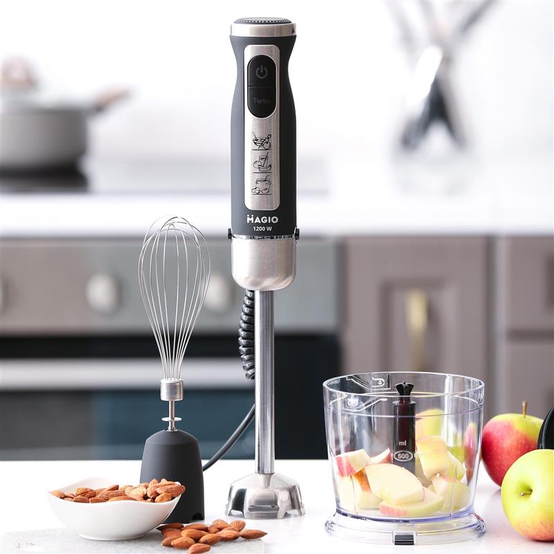 Блендерний набір MG-644 дасть вам змогу урізноманітнити ваше меню і приготувати новий кулінарний шедевр. Потужність блендера становить 1200 Вт, що забезпечує безшумну ефективну роботу впродовж тривалого часу. Заглибна частина та ніж зроблені з неіржавкої сталі — запорука стійкості до зношування й довговічності. Ергономічна ручка з приємним покриттям SOFT TOUCH.
