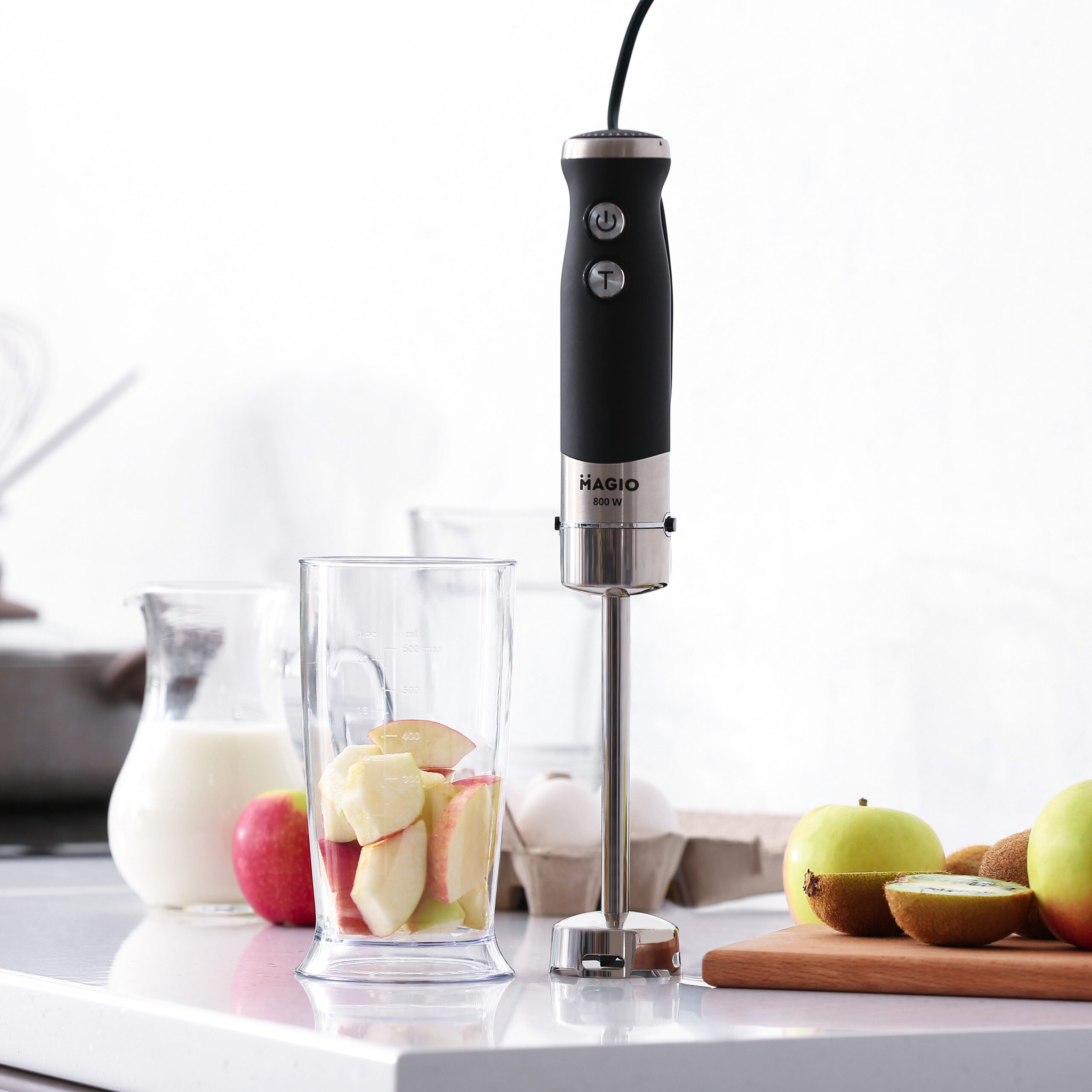 Блендер MG-647 дозволить різноманітнити ваше меню та приготувати новий кулінарний шедевр. Потужність блендера становить 800 Вт, що забезпечує безшумну ефективну роботу протягом тривалого часу. Занурювальна частина виконанана з нержавіючої сталі – запорука стійкості до зношування і довговічності. Блендер може працювати на 13 швидкостях, що плавно перемикаються. Перемикач знаходиться на держаку приладу, що дуже зручно. До комплекту входить пластиковий мірний стакан. Ці властивості в поєднанні з компактним дизайном роблять блендер незамінним помічником на вашій кухні.