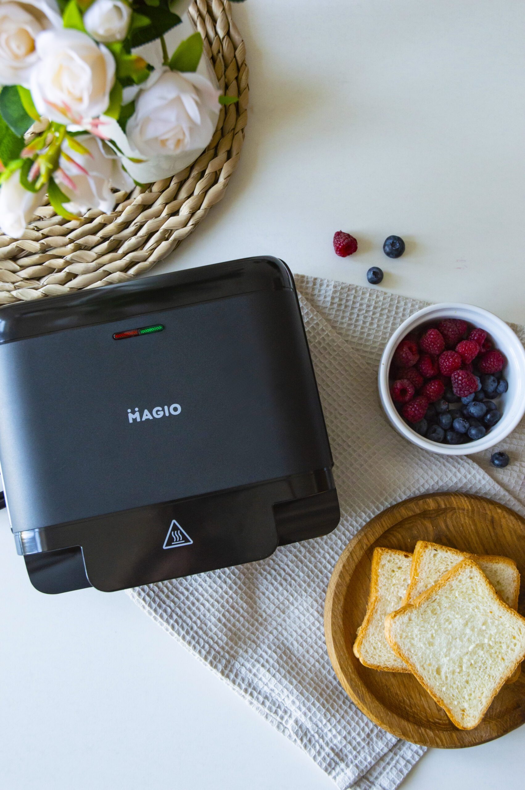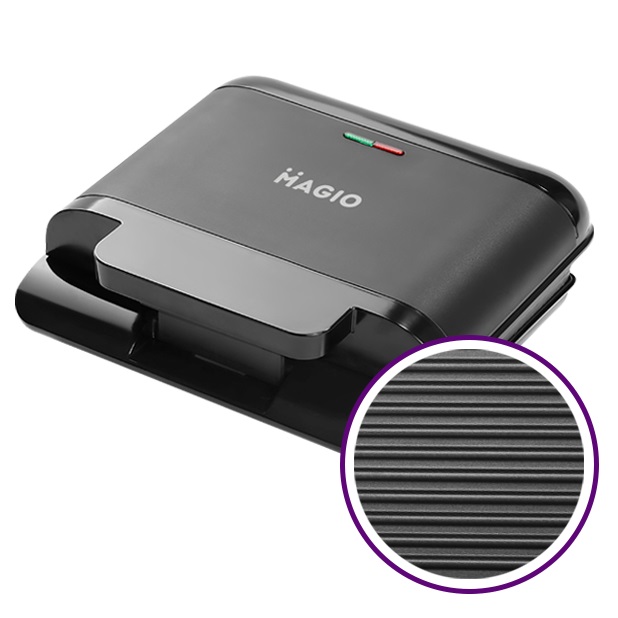 Корпус виготовлений із висококласного термостійкого пластику. Нагрівальний елемент потужністю 750 Вт забезпечить швидке і рівномірне нагрівання двох робочих поверхонь з керамічним покриттям. Бутербродниці Magio дуже зручні у користуванні, сендвічі не пригорають і легко витягуються. Завдяки компактним розмірам та фіксатору бутербродницю зручно зберігати. На кришці є світлові індикатори живлення та готовності до роботи, що полегшує контроль процесу приготування.