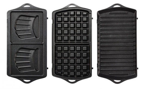 Робоча зона пристрою представлена пластинами, виготовленими з антипригарного матеріалу. Завдяки цьому їжа не прилипає і не пригорає в процесі приготування. У комплект входять пластини для приготування вафель, сендвічів і грилю.