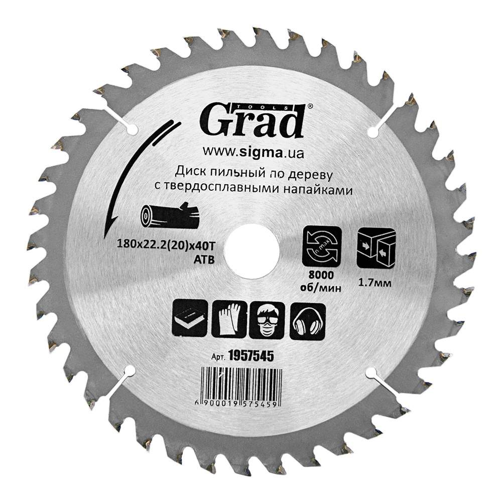 Диск пильний по дереву з твердосплавними напайками Ø180×22.2(20)×40Т, 8000об/хв GRAD (1957545)