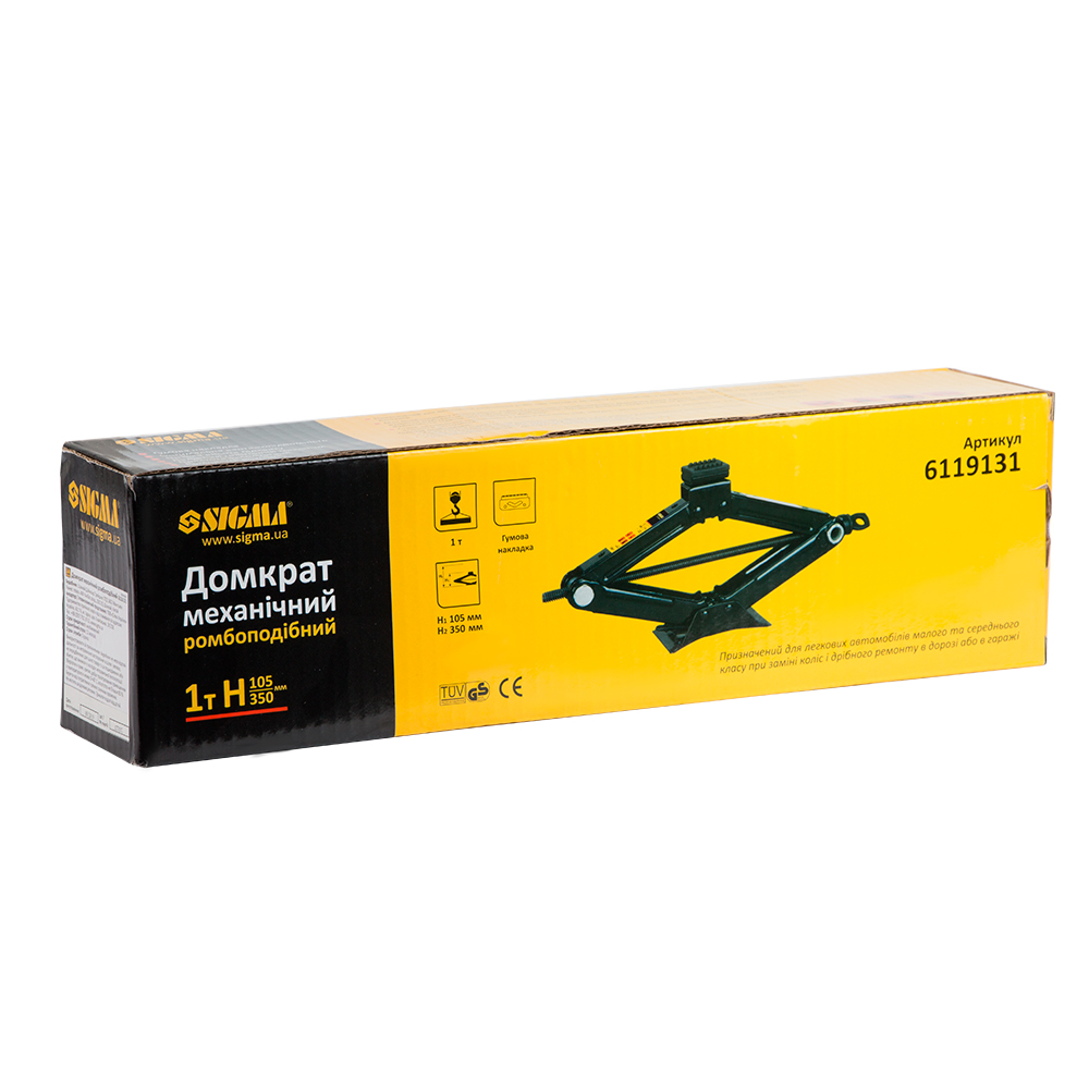Домкрат механічний ромбовидний 1т Н 105-350мм Sigma (6119131) призначений для виконання ремонтних робіт при поломці легкових автомобілів, а також для інших робіт з підняття невеликих вантажів.