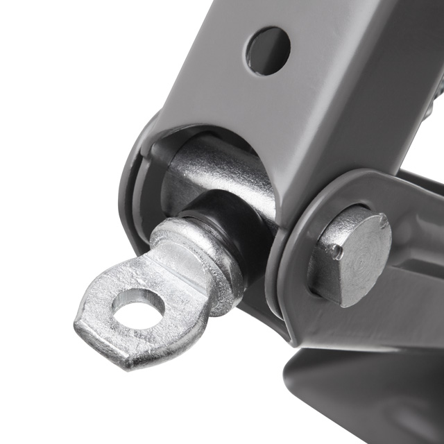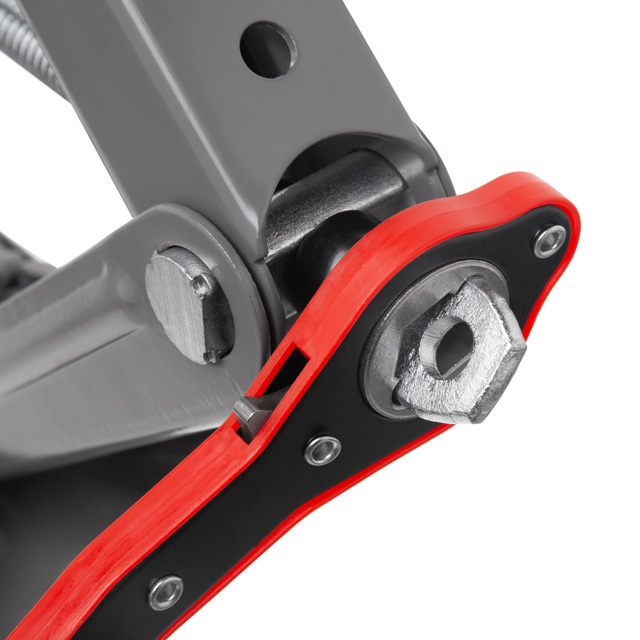 Домкрат виготовлений з легованої сталі — міцного і зносостійкого матеріалу, який забезпечує високу надійність і стійкість при навантаженнях. Конструкція з ребрами жорсткості гарантує довговічність, стійкість до деформації і безпечну експлуатацію протягом тривалого часу.