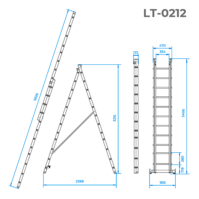 Конструкція дозволяє використовувати її як стрем’янку або як приставні сходи, а в складеному вигляді має невеликі габарити для зберігання. За допомогою ременів та замків безпеки, ви легко зможете встановити сходи у необхідному вам положенні. Функціональність драбини може бути розширена за допомогою додаткової сходинки-полиці LT-6000.