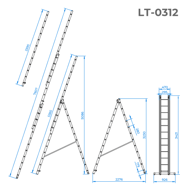 Конструкція дозволяє використовувати її як стрем’янку або як приставні сходи, а в складеному вигляді має невеликі габарити для зберігання. За допомогою ременів та замків безпеки, ви легко зможете встановити сходи у необхідному вам положенні. Функціональність драбини може бути розширена за допомогою додаткової сходинки-полиці LT-6000.