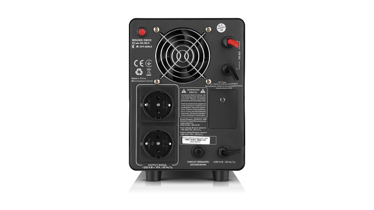 Лінійно-інтерактивне ДБЖ безперервної дії з тривалим часом резервування для підключення зовнішніх батарей RESERVE-1000 призначено для експлуатації зі свинцево-кислотними необслуговуваними акумуляторними батареями типу AGM з напругою 12 В. Принцип його дії засновано на перетворенні постійного струму зовнішніх батарей у змінний. Форма струму на виході – правильна синусоїда.