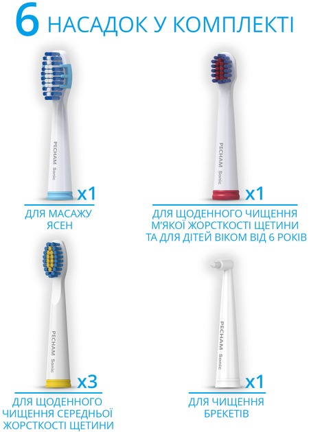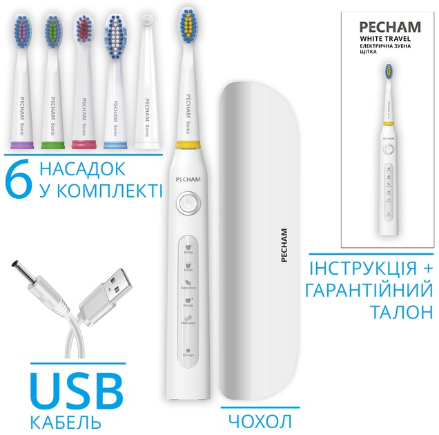 Електрощітка Pecham White Travel здійснює видалення нальоту, масаж ясен, відбілювання та полірування з використанням звукової технології з частотою 40 000 коливань на хвилину. Клінічні дослідження підтвердили: при щоденному використанні протягом 7 днів зуби стають білішими, після 14 днів використання покращується здоров’я ясен та ротової порожнини. Електрична зубна щітка Pecham White Travel призначена для дорослих та дітей, у тому числі чутливих зубів, характеризується: наявністю п’яти режимів: видалення нальоту, відбілювання, полірування, дбайливе та повсякденне очищення; автономна робота на акумуляторі – при експлуатації 2 рази на день протягом 30 днів без підзарядки; ємністю акумуляторної батареї 1500 мАг; номінальною потужністю 1 Вт; часом зарядки – до 4 годин. Зубна електрощітка пропонується зі змінними насадками в кількості 6 шт., Ступінь жорсткості щетинок - середня і м’яка. Матеріал виготовлення нейлону. Ручка та насадки мають білий колір, як додаткові опції електричні зубні щітки White Travel оснащуються: індикатор стан акумуляторної батареї; таймер на 2 хвилини з інтервалом 30 сек.