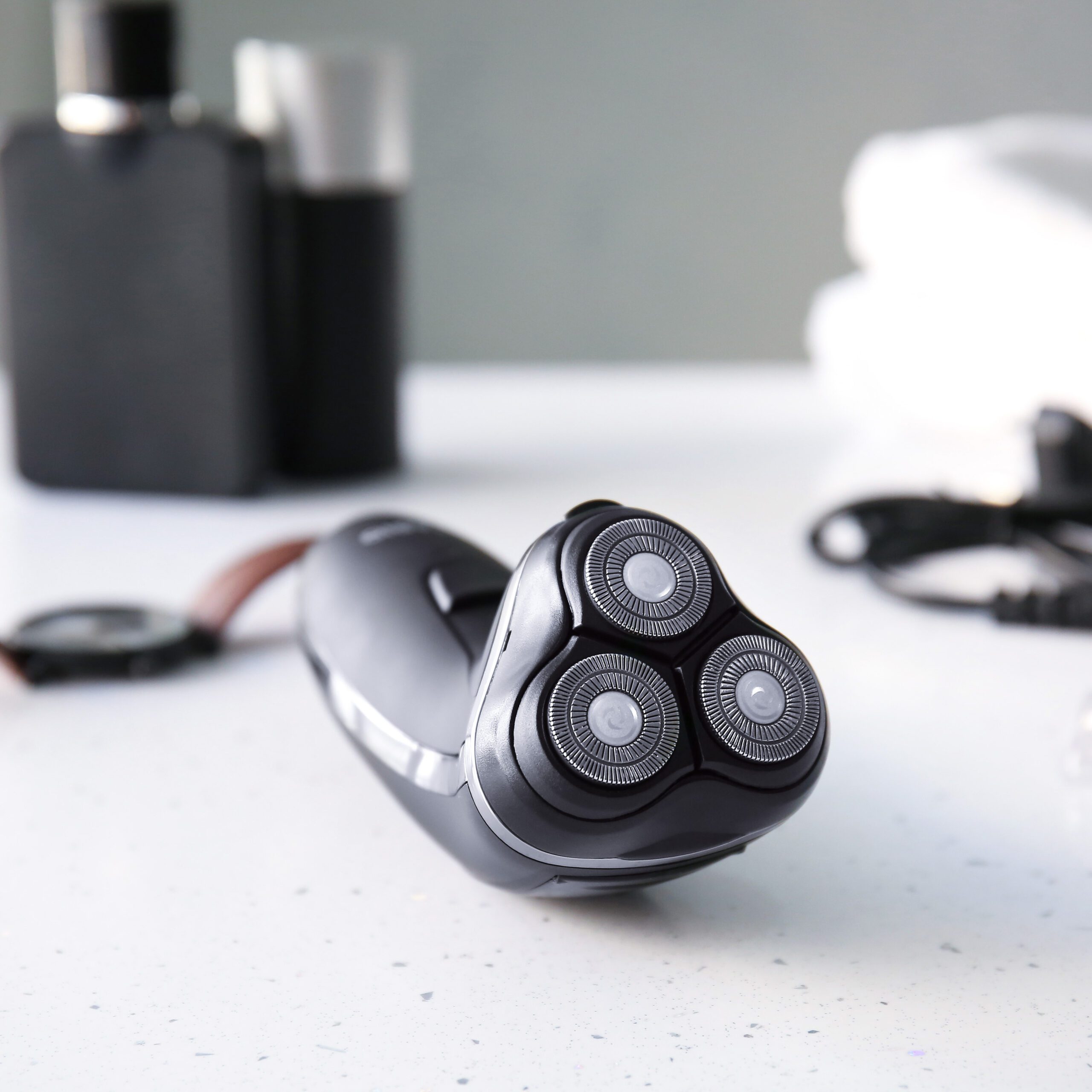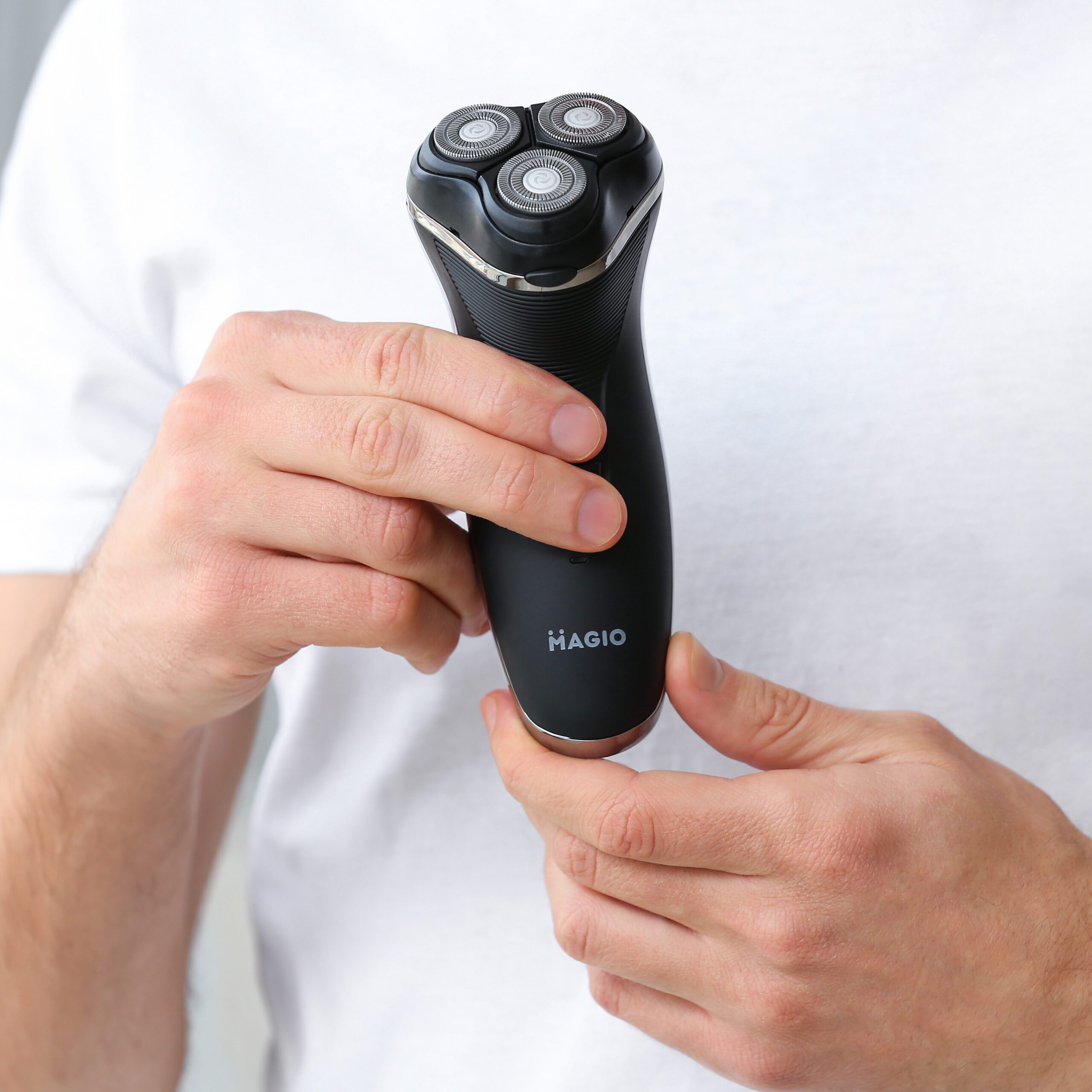 Електробритва MG-686 для вологого і сухого гоління з трьома рухомими бритвеними головками забезпечить ідеальний результат за рахунок щільного прилягання обертаються лез до шкіри. Ця модель роторної бритви з якісними подвійними лезами і систему повторення контурів делікатно ставиться до шкіри. Акумулятора після 8-ми годинної зарядки вистачає на 45 хвилин автономної роботи. Доглядати за бритвою простіше простого, досить просто промити її ріжучий блок під проточною водою не більше 5-ти секунд. Три плаваючих головки, тріммер для підрівнювання скронь, ергономічна рукоятка роблять використання приладу комфортним і безпечним.