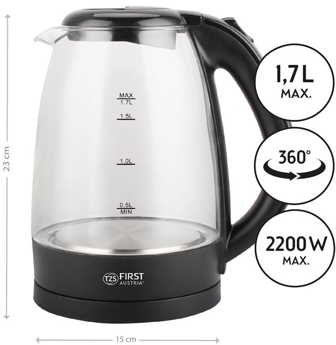 Завдяки з’єднувальній базі на 360° прилад можна встановити без проводу з усіх боків. Однаково зручний для правшів і лівшів. Прозорий чайник об'ємом 1,7 л виготовлений з ударостійкого і жаростійкого загартованого скла, яке завжди залишається без запаху і смаку навіть при регулярному використанні. Приємним доповненням є практична функція освітлення.
