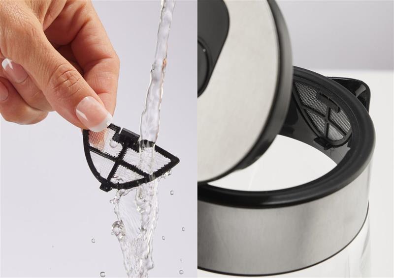Завдяки великому об’єму чайника Gorenje K17TRG 1,7 літра ви зможете закип’ятити воду відразу на всю сім’ю. Також дуже зручно, якщо до вас у гості прийшла велика компанія друзів. Якісний фільтр від накипу легко знімається і миється. Крім того, він запобігає капанню води під час наливання в чашку. Шнур живлення підключається до підставки, щоб ви могли вільно користуватися чайником. У підставці є спеціальне відділення для зручного зберігання шнура. Якщо в чайнику мало води або вона закінчилася, нагрівання автоматично вимикається. Крім того, чайник вимикається, коли вода закипає.