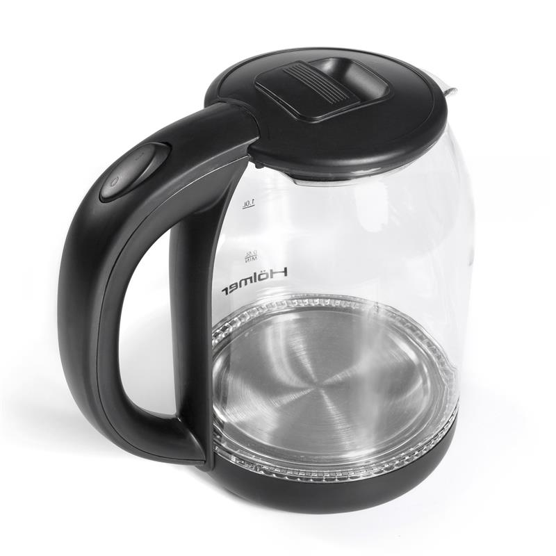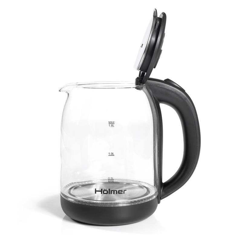 Чайник Holmer HKS-1950 має чорний колір та матове покриття, а також LED – підсвічування яке сигналізує про роботу чайника та красиво і яскраво підсвічує воду блакитним кольором.
