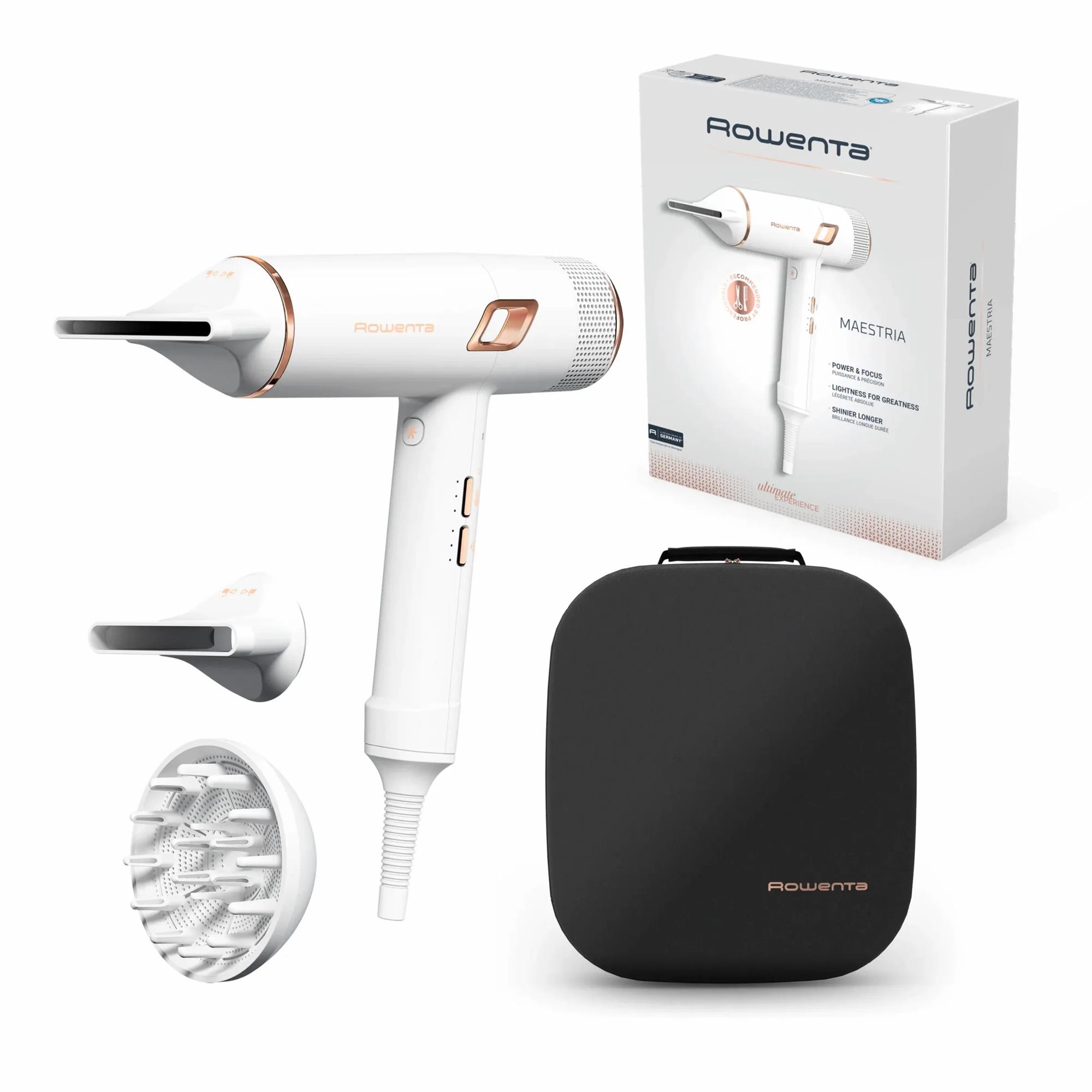 Фен оснащений тонким концентратором 5 мм для ідеального сушіння прямого волосся, 9 мм концентратором – для густого волосся, а також дифузором – для природного хвилястого волосся та надання об’єму.