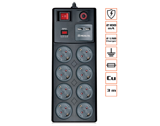 Мережевий фільтр-подовжувач REAL-EL RS-8F USB Charge з вбудованим USB зарядним пристроєм призначений для підключення до електричної мережі електроприладів і забезпечення їх захисту від високовольтних імпульсів напруги і постійної фільтрації високочастотних перешкод. Захист від грозових розрядів (блискавкозахист) Загальний двополюсний вимикач зі світловою індикацією 8 розеток із заземленням і захисними шторками Відновлюваний запобіжник не вимагає заміни 2 USB-порта для одночасної зарядки двох пристроїв USB зарядний пристрій підходить для більшості пристроїв Кабель з чистої міді без застосування сплавів