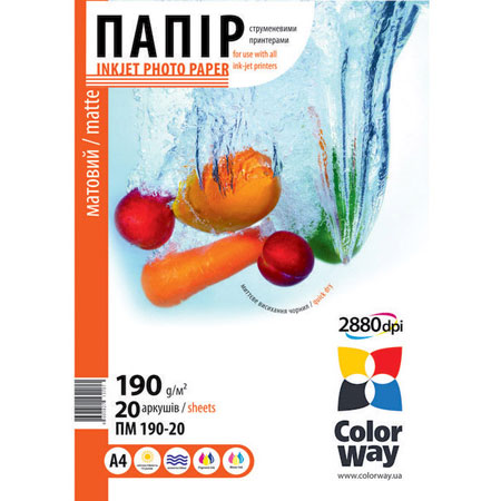 Матовий папір ColorWay для струменевого друку. Має високий ступінь білизни та матову рівну поверхню, забезпечує високий контраст, відсутність відблисків, відбитків пальців на нанесеному зображенні. Має широку колірну гамму і гарне вбирання чорнила. Підходить для водорозчинних та пігментних чорнил. Чим менший у паперу показник щільності, тим менше має бути заливка аркуша. Зберігати у сухому місці осторонь сонячного світла. Температура зберігання від 5 до 25°С. Не містить шкідливих здоров'я речовин. Надруковані знімки рекомендовано зберігати в альбомах або під склом. Ця модель паперу призначена лише для друку на струменевому принтері та персонального використання.