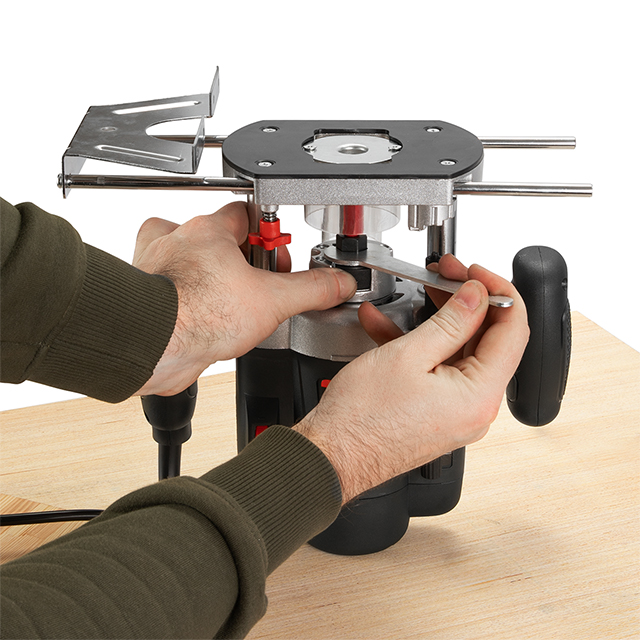 Ця модель електрофрезера має блокування шпинделя для швидкої заміни фрез за допомогою всього одного ключа, який входить до комплекту.
