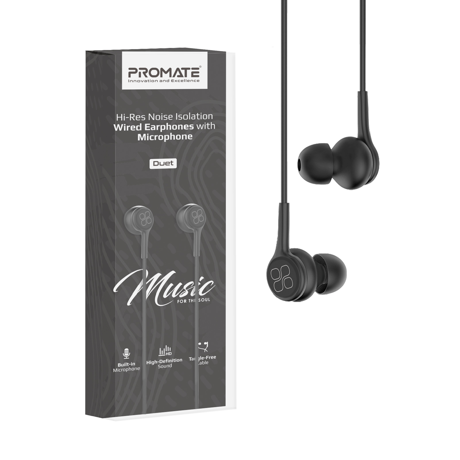 Duet — стильні вакуумні навушники від Promate. 10 мм динаміки, пасивне шумопоглинання та лаконічний дизайн з матовим покриттям — гучно, об’ємно і красиво.