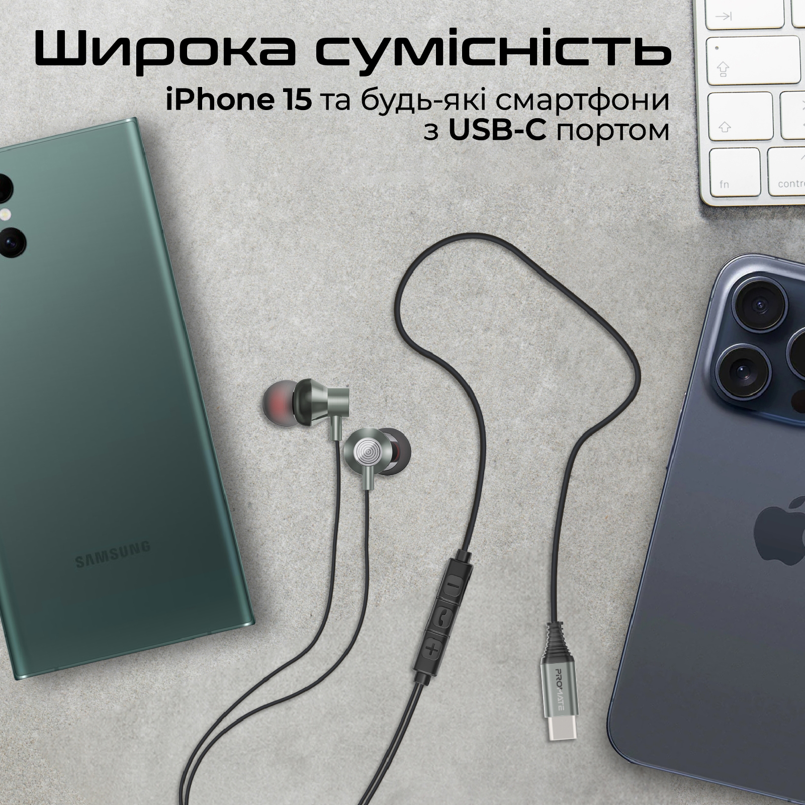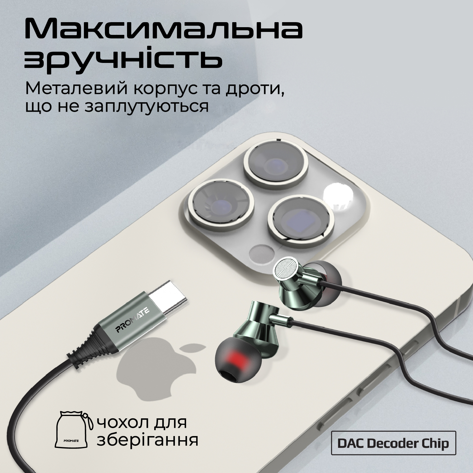 Silken-C від Promate - дротові навушники-вкладки з USB-C конектором. Чисте басове звучання та HD мікрофон в ергономічному корпусі роблять їх ідеальними для тривалого прослуховування музики. Особливості: - Стерео звук: 10 мм динамічні випромінювачі забезпечують глибоке та збалансоване звучання на всьому діапазоні частот - Ергономічний дизайн: Легкі навушники анатомічно правильної форми. Вони зручно лежать у вусі та не викликають дискомфорту навіть після тривалого використання - HD мікрофон: З системою шумозаглушення, гарантує високу якість передачі голосу без зайвих перешкод - Просте управління: 3 кнопки на вбудованому пульті дозволяють відповідати на дзвінки, керувати треками та гучністю - Пасивне шумозаглушення: Вакуумні амбушури ізолюють від сторонніх звуків - ні шум траси, ні крики на вулиці не завадять сповна насолодитися крутим звучанням улюблених треків - Максимальна зручність: Спеціальні проводи, що не заплутуються та сумка для зберігання збережуть час і нерви - Широка сумісність: Гарнітура повністю сумісна з усіма пристроями з USB-C портом