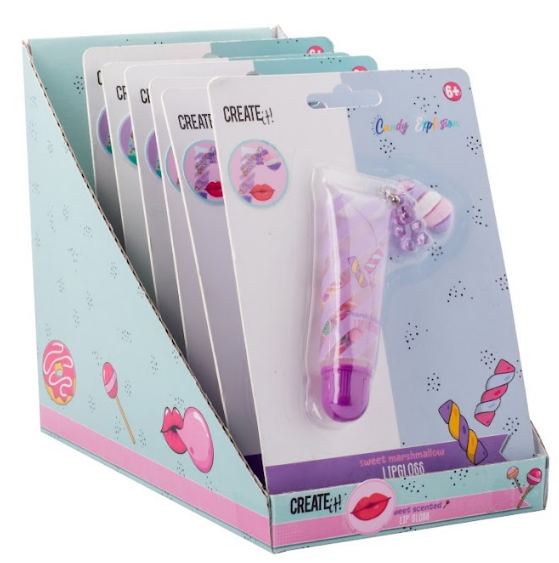 Блиск для губ у тубі, в асортименті 3 види. Рекомендований вік: від 6 років. Упаковка: блістер 2см x 11см x 16,5см. Дисплей: 9 шт, розмір: 19см x 12см x 17,5см.
