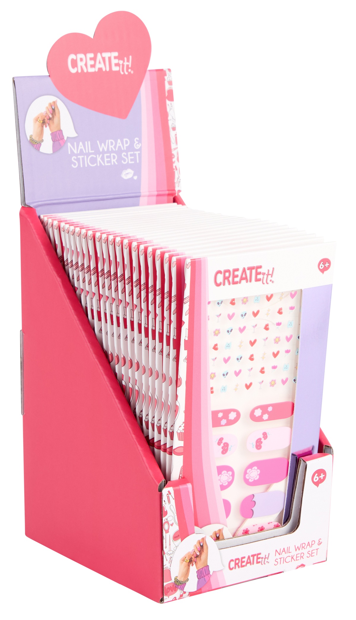 Набір наклейок (91 шт) і накладних нігтів-наклейок (10 шт), які можна зменшити під розмір нігтя за допомогою пилки, яка входить в набір. Рекомендований вік: від 6 років. Дисплей: 24 шт, розмір: 12,7*9,2*16,1 см.