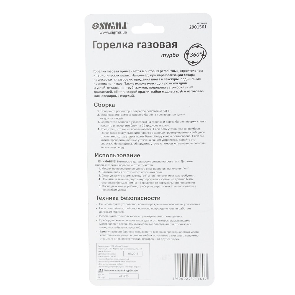 Пальник газовий турбо 360° Ø30мм Sigma (2901561) застосовується в побутових, ремонтних, будівельних та туристичних цілях. Наприклад, при карамелізації цукру на десертах, глазурування, надання кольору та текстури, підпалювання міцних напоїв. Також використовується для розпалювання дров та вугілля, відтавання труб, замків, підігріву автомобільних двигунів, випалення старої фарби, паяння мідних труб та виготовлення ювелірних виробів.