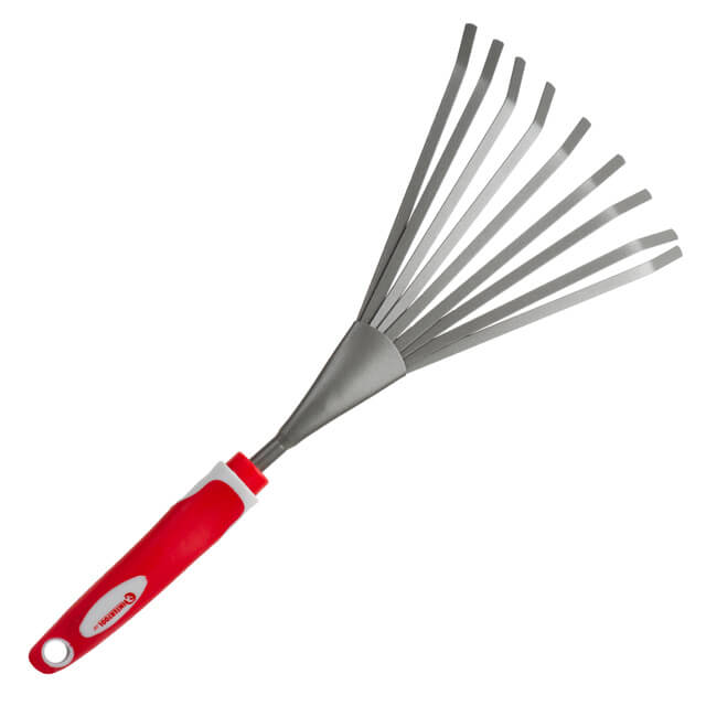 Така модель граблів виготовлена з надійної високоякісної сталі та вкрита антикорозійною фарбою, а місце стику прутків з ручкою посилено. Форма ручки повторює вигини долоні з підпальцевим упором, що гарантує максимум комфорту в роботі, а гумові вставки не дозволяють ковзати руці. Отвір на руків'ї допоможе вам зручно зберігати інструмент, підвісивши його на гачок.