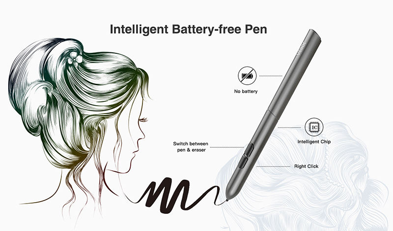 Перо без батарейок з 8192 рівнями чутливості до тиску. Перо з високою чутливістю і не потребує заряду, забезпечує безперебійне використання.