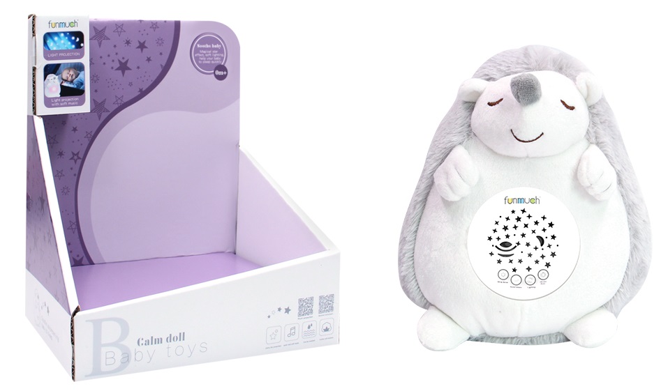 Іграшка музична м'яка з проектором ЇЖАЧОК ТМ Funmuch. Має світлові та звукові ефекти: відтворює 20 приємних мелодій та проекцію нічного зоряного неба змінюючи 5 кольорів світла. Працює безперервно протягом 20 хвилин. Можна прати без музичного блоку. Живлеення: 3 батарейки типу AAA (в комплект не входять). Матеріал: текстиль, пластик. Вік: 0 місяців+ (від народження).