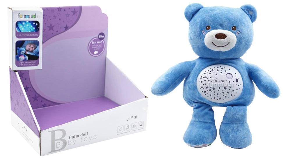 Іграшка музична м'яка з проектором ВЕДМЕДИК ТМ Funmuch. Має світлові та звукові ефекти: відтворює 20 приємних мелодій та проекцію нічного зоряного неба змінюючи 5 кольорів світла. Працює безперервно протягом 20 хвилин. Можна прати без музичного блоку. Живлення: 3 батарейки типу AAA (у комплект не входять). Матеріал: текстиль, пластик. Вік: 0 місяців + (від народження). Розмір іграшки 41х37х17. Упаковка: відкрита коробка 27х18х28.
