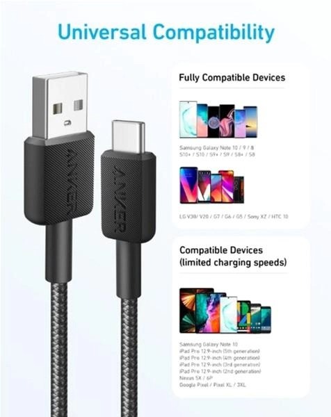 Кабель Anker 322 USB-A - USB-C, 0.9 м, Black (A81H5G11)