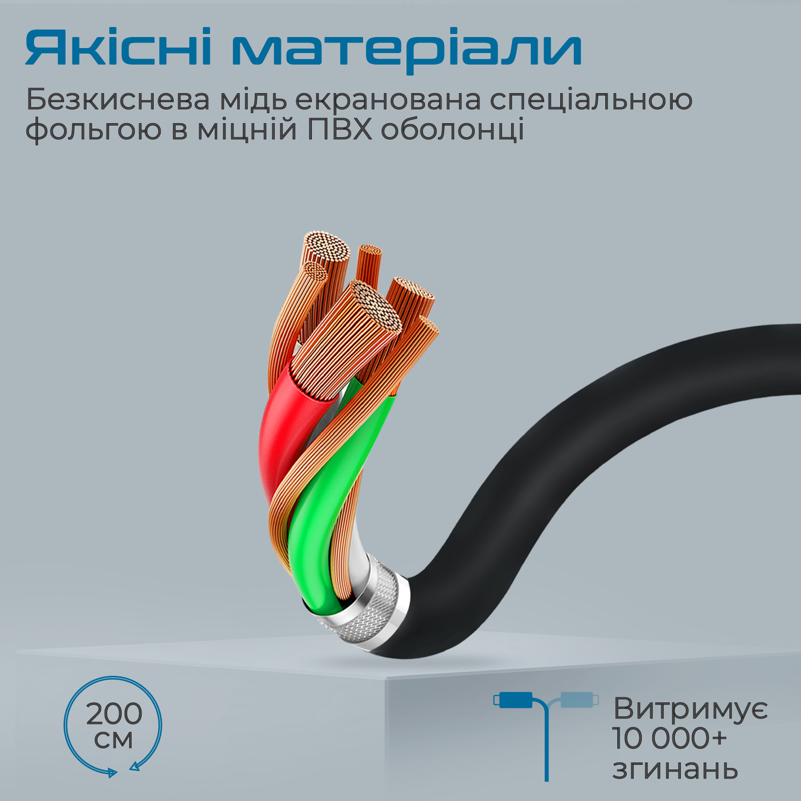 - Надійний зовні: Зносостійка ПВХ оболонка в нейлоновому обплетенні та протектори біля конекторів витримують понад 10000 згинань