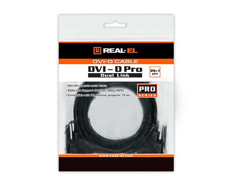 REAL-EL DVI-D - DVI-D (24 + 1) Pro призначений для підключення Аудіо-відео сигналу з допомогою DVI-D. Кабель DVI (24 + 1) тато-тато Підтримка DUAL link 480/720 / 1080p HDTV Сумісний з ПК, проекторами, ТВ і ін.