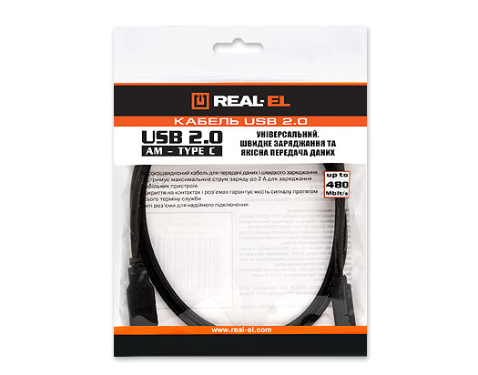 Кабель REAL-EL USB 2.0 AM-type C служить для підключення комп"ютера до портативних пристроїв, разветвителям, принтерів, сканерів тощо