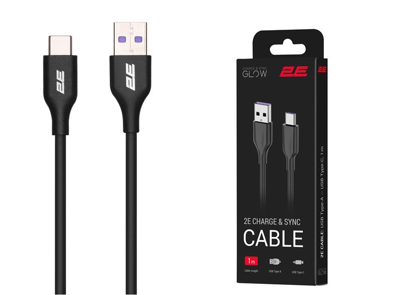 Кабель USB-A > USB-C заряджання/синхронізації 2E 1м, Type-C, Glow, чорний
