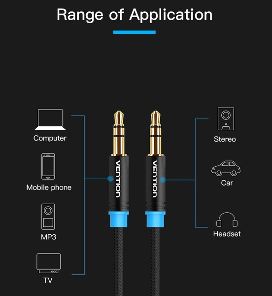 Кабель Vention Audio 3.5 mm M - 3.5 mm M призначений для передачі аналогових стереозвуковых сигналів між аудіо, аудіо-відео і (чи) комп"ютерними пристроями або їх компонентами. Ви можете підключити комп"ютер (ноутбук), MP3-плеєр, або смартфон до гарнітури, активних акустичних систем і іншої мультимедійної техніки.