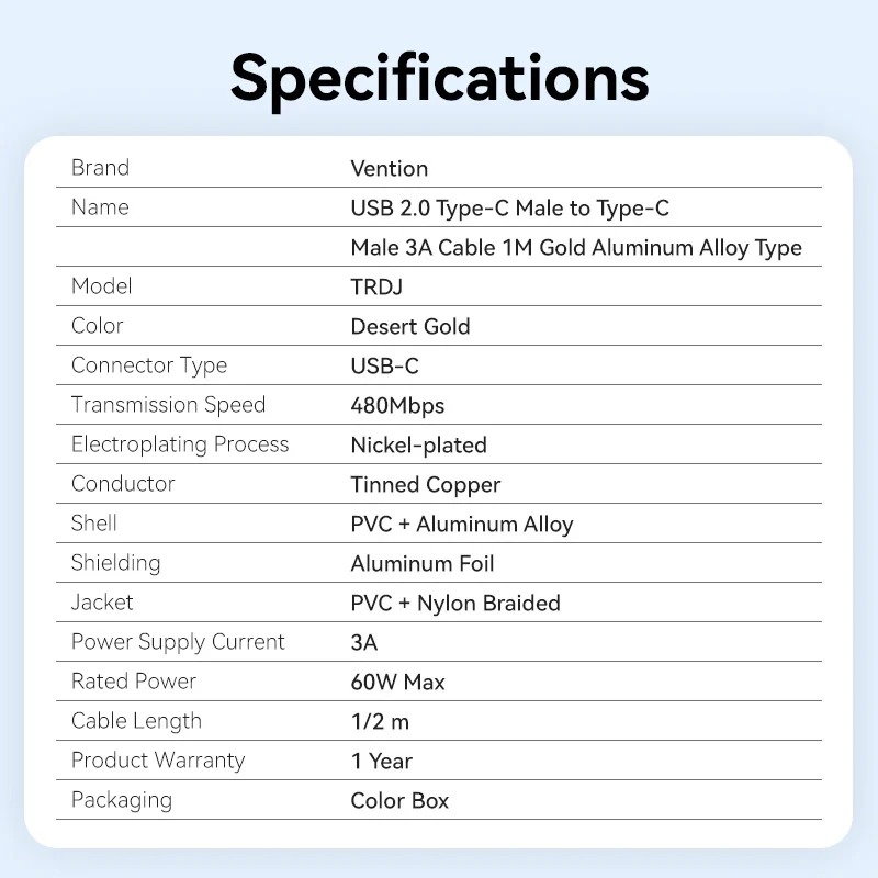 Кабель Vention USB Type-C - USB Type-C (M/M), 60W, 3A, 2 м, Copper (TRDJH)