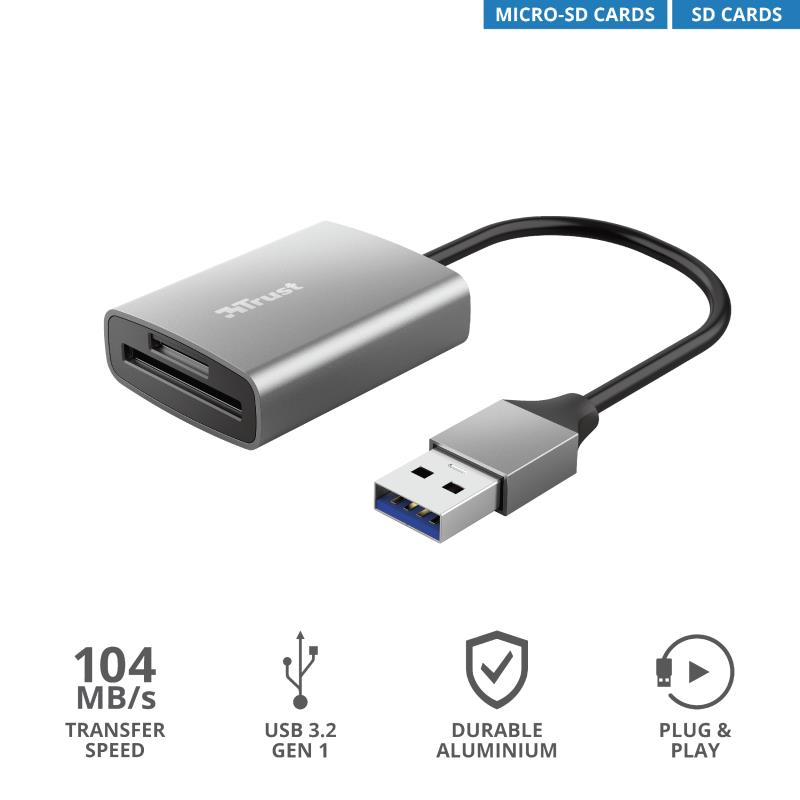 Кардрідер Trust Dalyx USB-A 3.2 > SD/microSD, Алюміній, 0.08м, Сірий