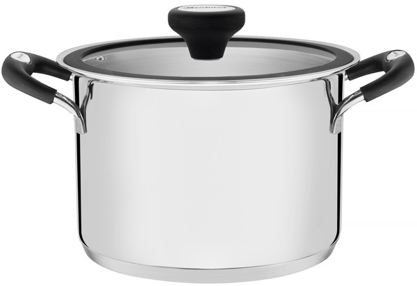 Каструля TRAMONTINA Solar silicone, висока. Об'єм: 4.5 л Діаметр: 20 см. Товщина стінки: 0,7 мм. Матеріал: нержавіюча сталь 18/10. Тришарове дно (нержавіюча сталь 18/10 – алюміній – нержавіюча сталь 18/Cr). Кришка з жароміцного скла з силіконовим обідком та отвором для випуску пари. Аксесуари виготовлені з термостійкого силікону.