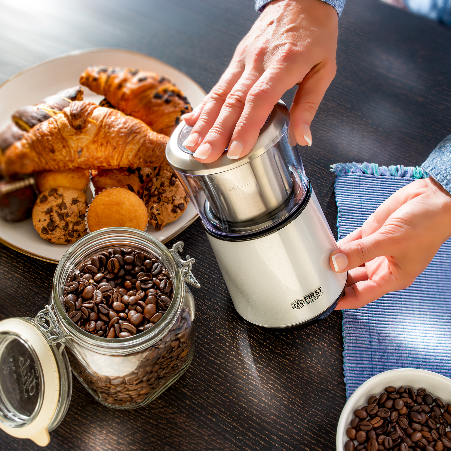 З цією практичною кавомолкою швидко і легко молоти і подрібнювати кавові зерна, а також злаки, трави чи горіхи. Незалежно від того, чи ви хочете випити свіжомеленого еспресо або подрібнити горіхи: прилад працює на потужному, повністю автоматичному рівні потужності 200 Вт і управляється за допомогою кнопки включення. Компактний розмір та сучасний дизайн кухонного пристрою дозволяють легко зберігати його на вашій кухні.