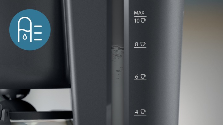Індикатор рівня води дозволяє легко додати потрібний об’єм води для заварювання від 1 до 10 чашок кави. Всього 10 хв для заварювання повного глека кави.