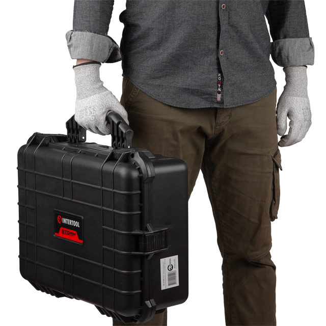 Кейс також обладнаний ручкою для комфортного транспортування. Все обладнання зручно розміщається в чемодані. Завдяки перфорованому і кубічно нарізаному поролону можна швидко сформувати необхідного розміру комірку під інструмент, фотокамери тощо.