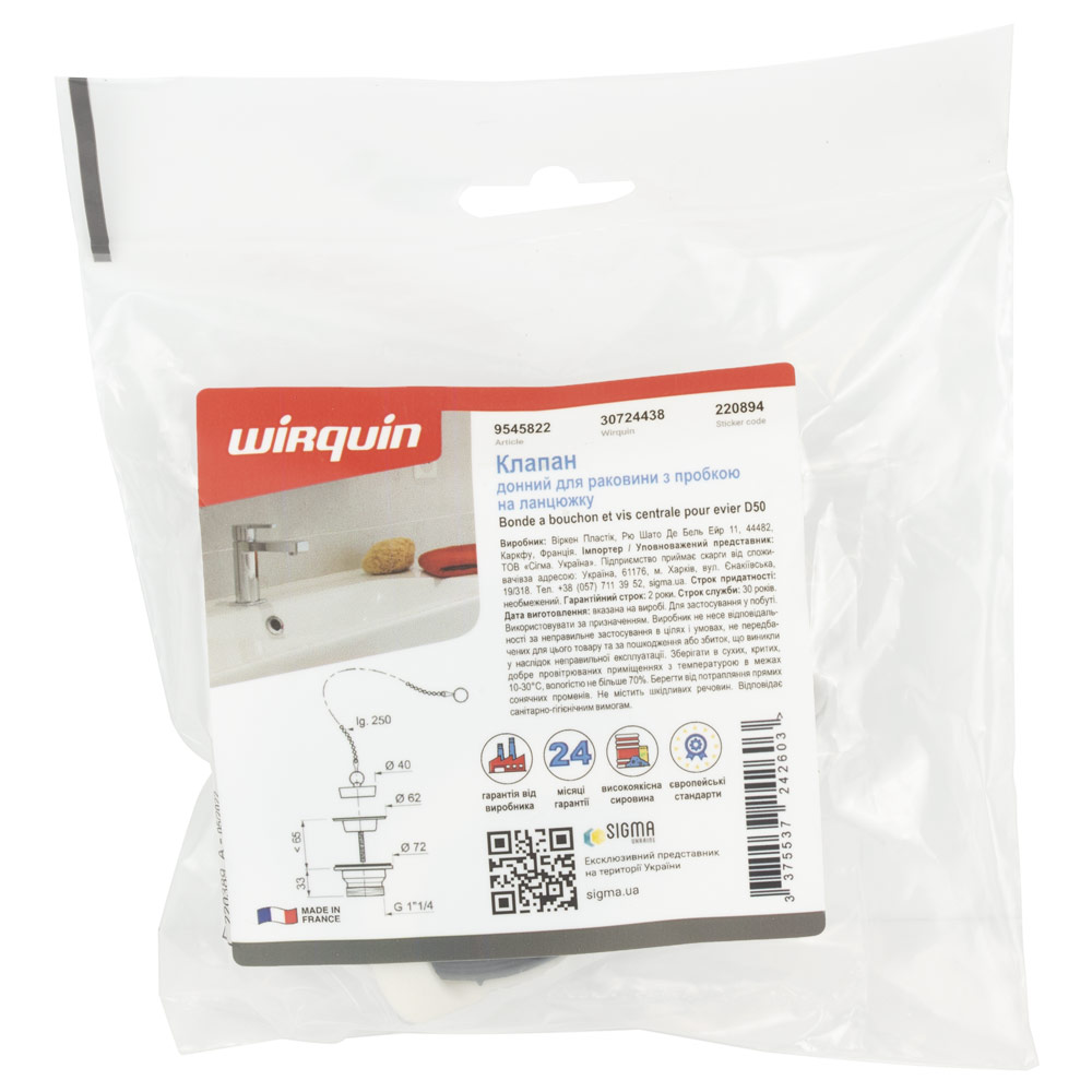 Клапан донний для раковини з пробкою на ланцюжку 1¼" Ø33мм WIRQUIN (9545822)