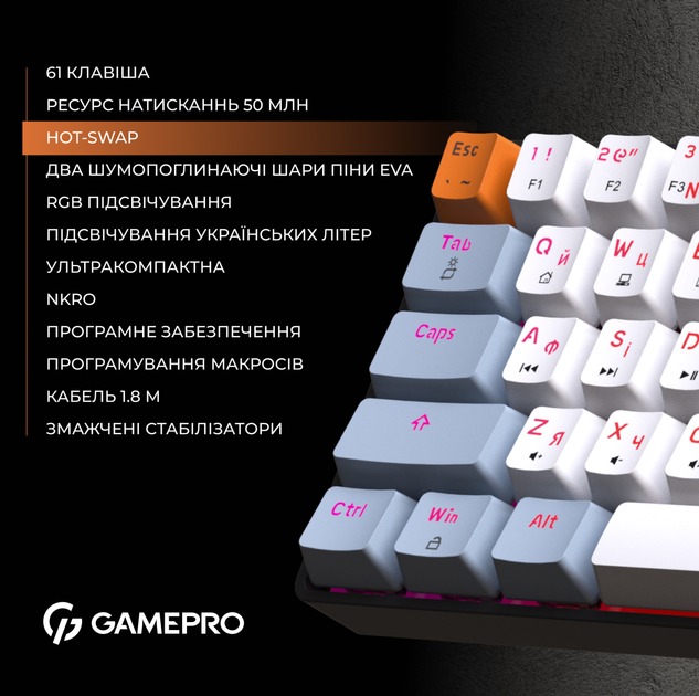 Механічна клавіатура MK130R – це справжня знахідка для тих, хто цінує стиль, функціональність та мінімалізм. Вона має ультракомпактний форм-фактор у 60%, що означає відсутність не тільки цифорового блоку, а і усіх допоміжних клавіш. Але це не стає проблемою, бо всі функції відсутніх клавіш компенсуються комбінаціями, а її малий розмір дозволяє зекономити дуже багато місця на робочому столі, залишаючи купу вільного простору для інших пристроїв. А її елегантний чорний корпус та кейкапи в білому та сірому кольорі створюють стильний вигляд, який підкреслює вашу індивідуальність.