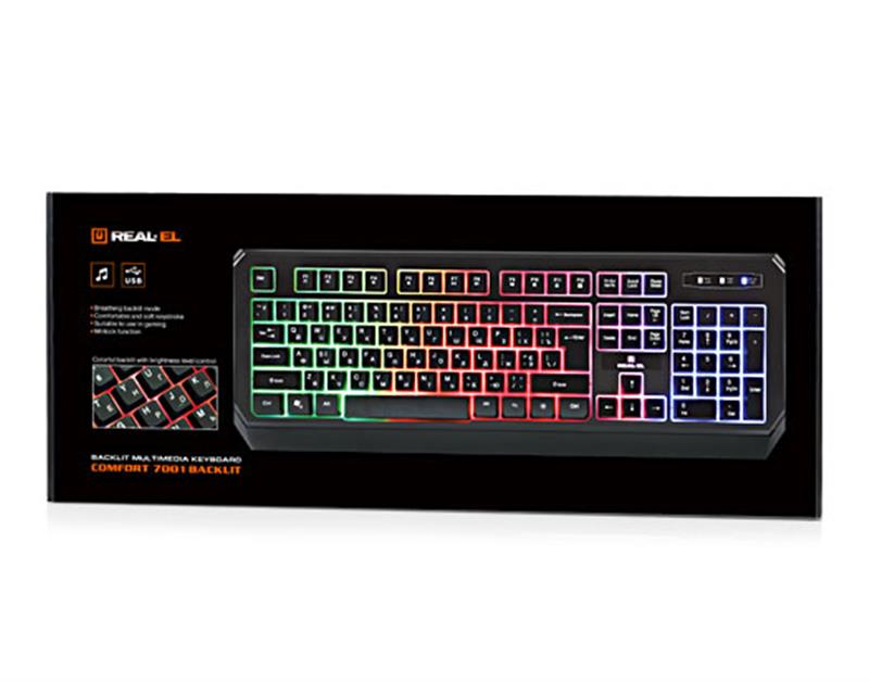 Особливістю мультимедійної клавіатури з підсвічуванням REAL-EL Comfort 7001 Backlit є кольорове підсвічування клавіш, функція Winlock зі спеціальним світловим індикатором, можливість використання в іграх, комфортний м'який хід клавіш. Особливості: Багатокольорове підсвічування клавіш з регулюванням рівня яскравості Режим «дихання» Комфортний та м'який хід клавіш Підходить для використання в іграх Функція Winlock