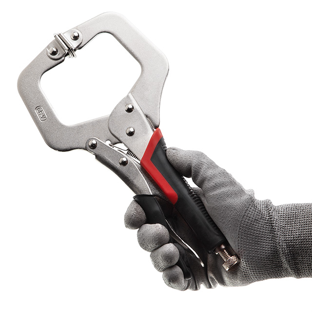 За допомогою регулювального гвинта можна підібрати потрібну силу стиснення. Скидання фіксації відбувається дуже просто - достатньо натиснути на важіль під основною ручкою. Прогумовані зручні ручки дозволяють зручно працювати навіть вологими або забрудненими руками та забезпечують чудове утримання під час роботи.