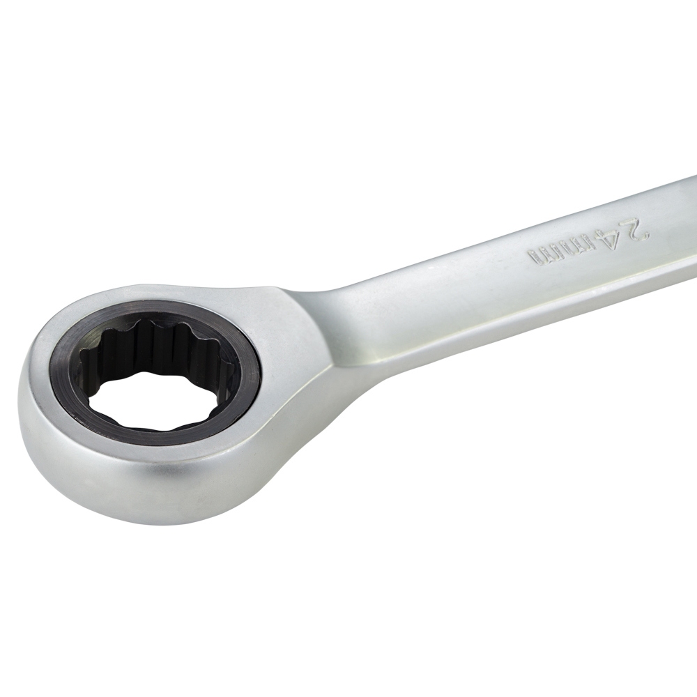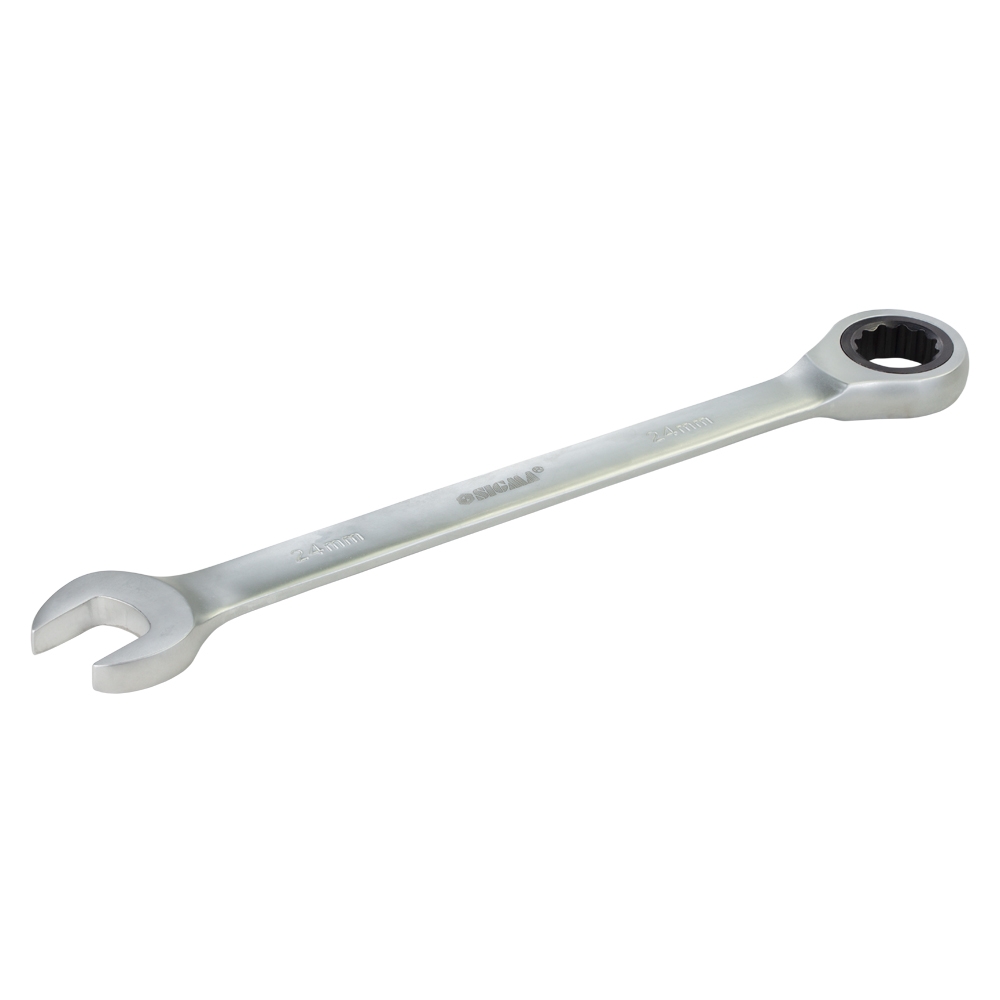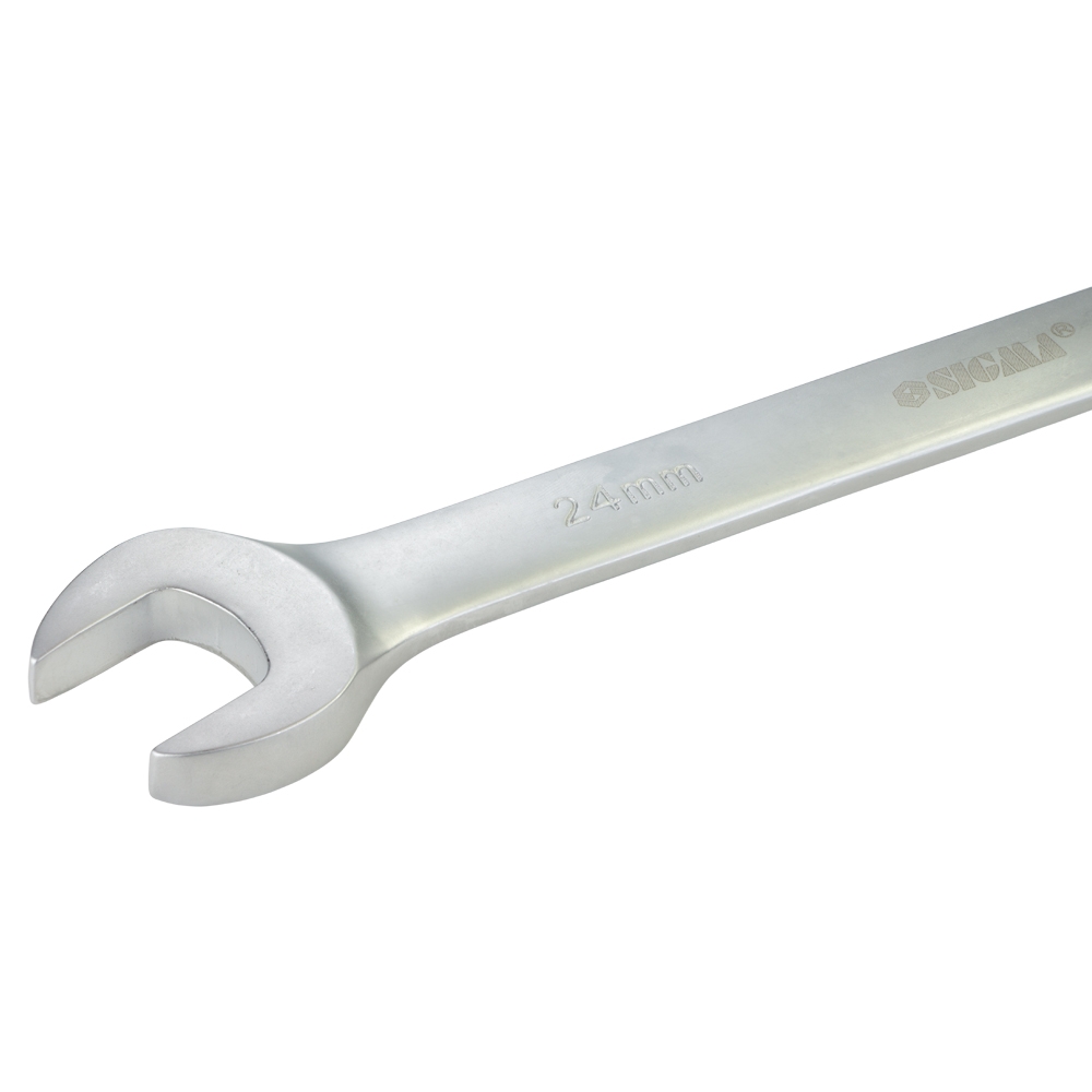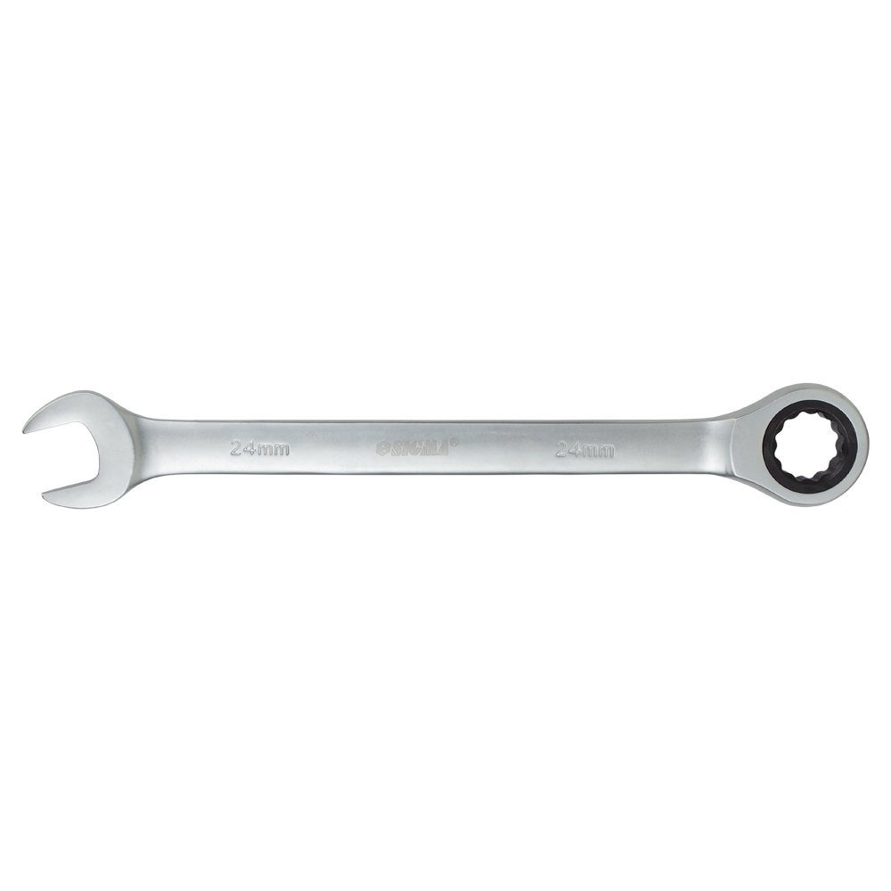 Ключ ріжково-накидний тріскачковий 24мм CrV polished SIGMA (6022241) виготовлений з хром-ванадієвої сталі, має антикорозійне покриття з хрому. Рожкова і кільцева зівка ключа відполірована. Призначений для монтажу-демонтажу різьбових з'єднань. Профіль кільцевого зіва має 12 граней, що збільшує площу зіткнення робочих поверхонь та знижує ризик деформації граней кріплення при монтажі. Кут нахилу кільцевого зіва щодо площини ключа робить монтаж зручнішим.
