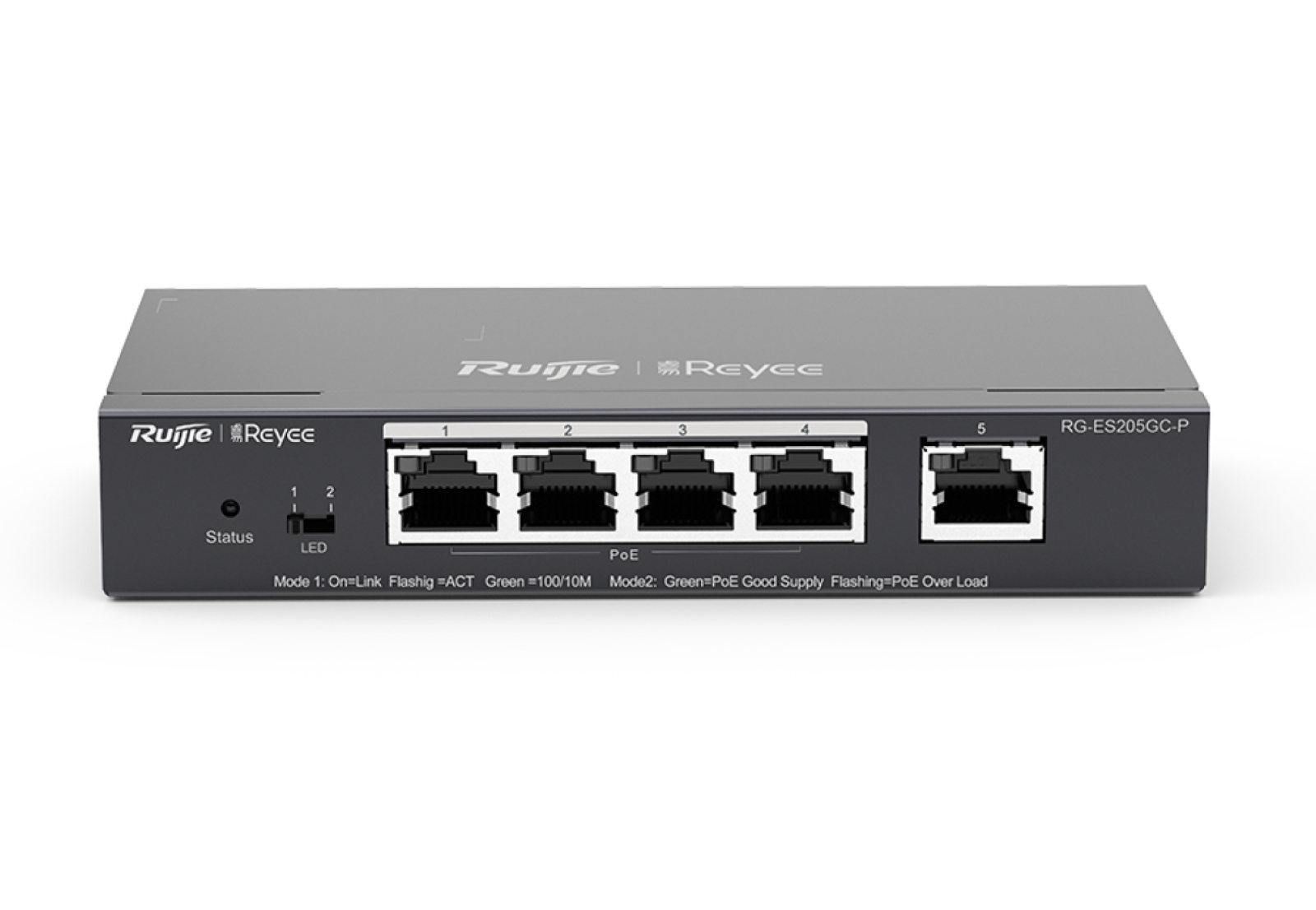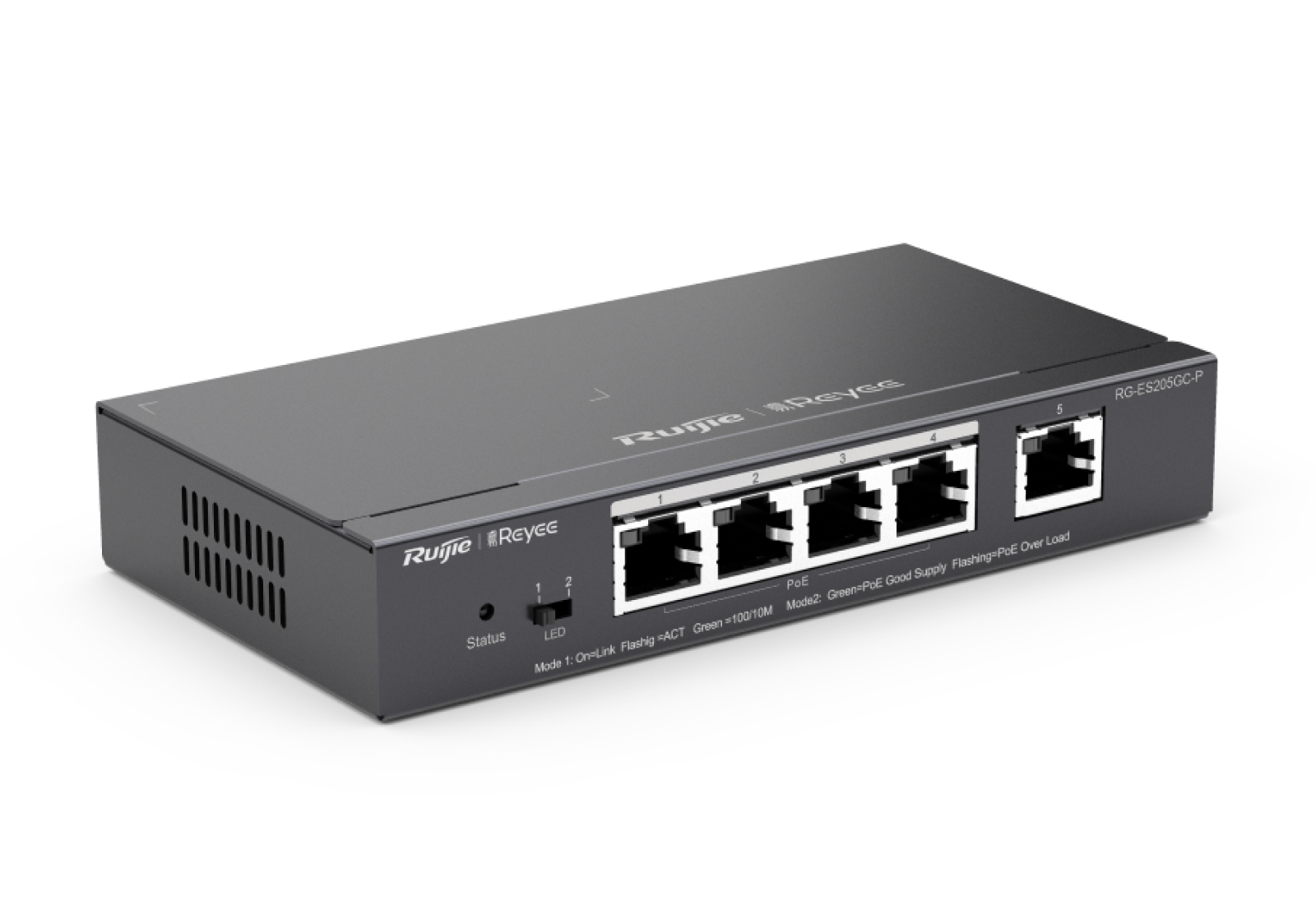 Комутатор Ruijie Reyee RG-ES205GC-P (4xGE PoE+, 1xGE, max PoE 53W, робочий стіл, стельовий номер, Ruijie Cloud, Web Smart)