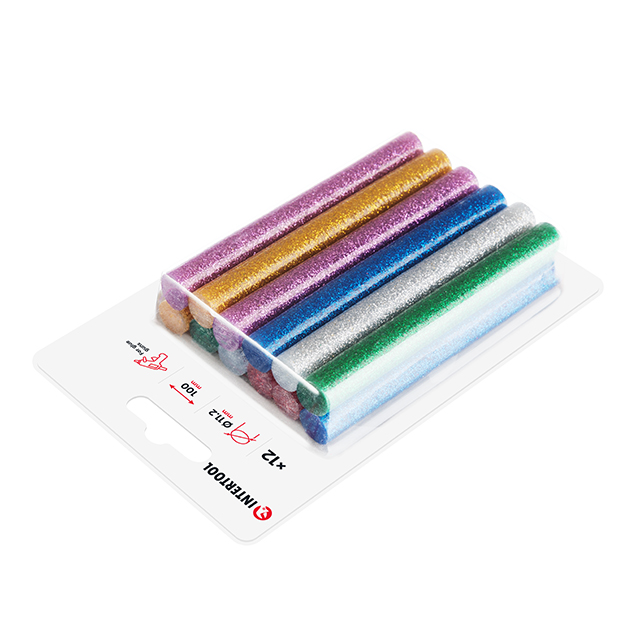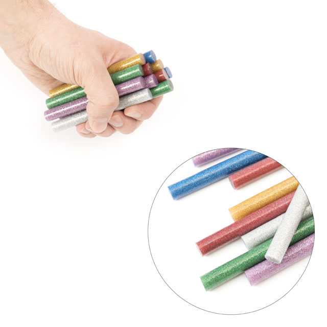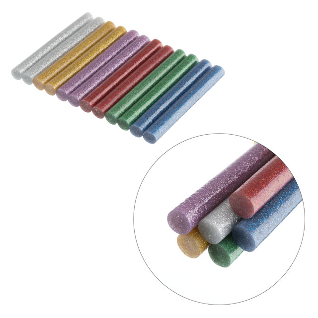 Кольорові клейові стержні з блискітками, в комплекті 6 кольорів: срібло, золото, червоний, бузковий, зелений, синій. Діаметр стрижня 11,2 мм - один із найпоширеніших і найпопулярніших розмірів, підходить до будь-яких марок клейових пістолетів. Сам стрижень довжиною 100 мм, в упаковці - 12 штук.